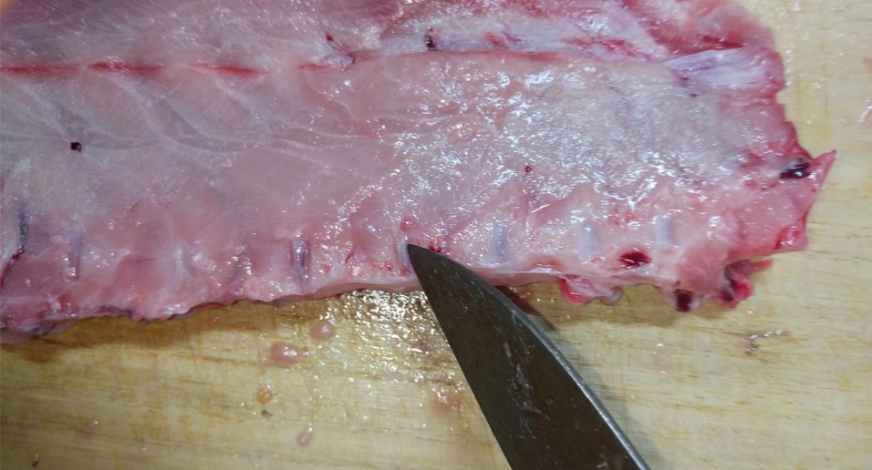 - 尾びれ側の端に、皮目に向かって浅く切れ目を入れる(皮は切り落とさない)