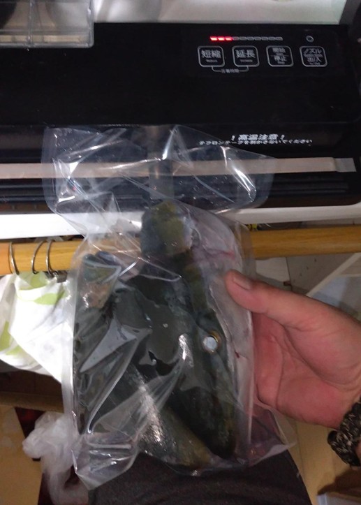 こんな感じで専用の真空パックに入れ、真空包装します。(右の黒いもの:真空包装機)