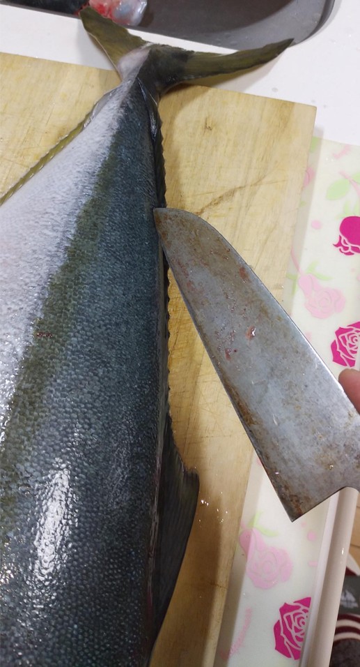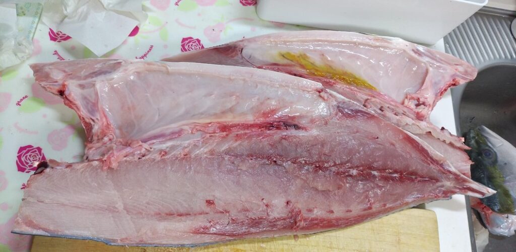 ※50cmくらいのまな板ですが、少しはみ出てますね。頭と尾びれを切り落とせば、無理なく捌けました。